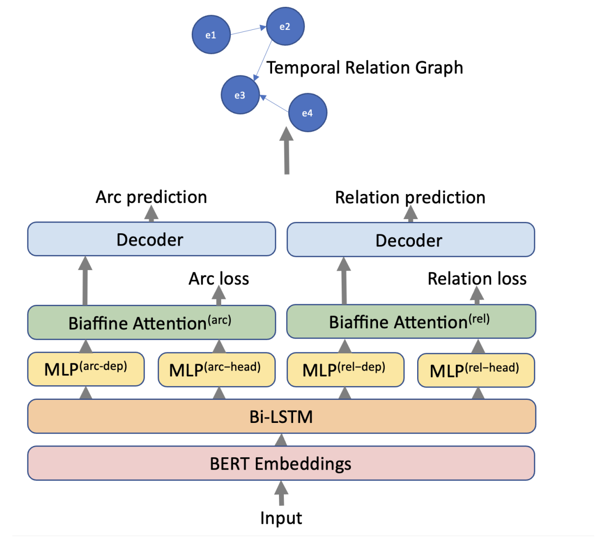 Our approach utilizes a layered architecture to extract temporal relations from text. At the base, we have BERT embeddings that capture contextual information from the input. These feed into a Bi-LSTM layer that adds sequential understanding. For specific relation extraction, we use a biaffine attention mechanism with Multilayer Perceptrons (MLPs) to focus on the dependency (arc) and the type of relationship (relation) between events. This structure enables precise predictions of temporal relations, forming a graph that represents the interconnectedness of events within the text.